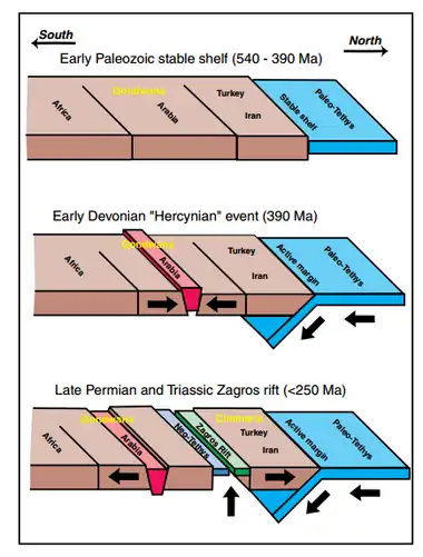 Thermal subsidence and Arabian plate stretching (that resulted from the fragmentation of Gondwana in the Late Permian) resulted in extensional faulting and the early rifting of Zagros that opened the Neo-Tethys Sea.[3]