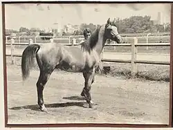 Persik was considered an Arabian stallion descended from Polish and Russian bloodlines.[3][11] He descended from the mare Emese, imported to France in 1877, one of whose descendants is Caravane, an oriental Arabian horse born in 1907 by Chakir, himself the sire of Carabine and the mare Djebel.[10] Djebel was imported to the Tersk Stud in the USSR, along with the filly who was Persik's great-granddam, Dikarka.[10] Denouste, Persik's paternal great-great-grandfather, was recognized as the best Arabian speed stallion of the 20th century.[10] Persik was thus descended from one of the oldest French oriental strains imported into the USSR and Poland, with crosses of English, Polish and Egyptian oriental strains.