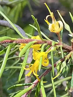 Persoonia hindii is an erect or spreading shrub with many stems that grow from an underground stolon about 5 cm (2 in) underground. The stems reach to a height of 0.3–1.0 m (1–3 ft) with smooth grey bark on older growth. Younger stem are mostly dull red and are covered with greyish hairs. The leaves are arranged alternately and are linear to oblong, mostly 15–27 mm (0.6–1 in) long, 1–2 mm (0.04–0.08 in) wide, succulent and more or less semi-circular in cross-section. Young leaves are slightly hairy but become glabrous as they age. The flowers are arranged singly or in small groups of up to thirteen in leaf axils or on the ends of branches, with a scale leaf at the base of each flower. Each flower is on the end of a hairy dull red pedicel 2.5–5 mm (0.1–0.2 in) long. The flower is composed of four hairy tepals 12–15 mm (0.5–0.6 in) long, which are fused at the base but with the tips rolled back. The central style is surrounded by four yellow anthers which are also joined at the base with the tips rolled back, so that it resembles a cross when viewed end-on. The ovary is glabrous. Flowering occurs mainly from January to March and is followed by fruit which are dull green drupes 8–9.5 mm (0.3–0.4 in) long and about 6 mm (0.2 in) wide.[2][3]