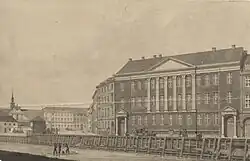 In 1784, it changed hands again when it was acquired by the wealthy merchant Pierre Peschier. He was from Geneva but had come to Denmark in 1768 where he had initially worked for Frédéric de Coninck before starting his own trading house. In the Great Fire of 1795, which began at Gammelholm, Peschier's house was one of the first buildings to be destroyed.[1] Peschier commissioned royal architect Caspar Frederik Harsdorff to design a new house which was completed in 1798. Peschier celebrated the inauguration of his new house with great festivities, attended by members of the royal family. The crisis years of the 1800s, with the British bombardments of Copenhagen in 1801 and 1807, were, however, hard for his business and in 1811 he had to sell his mansion.[2]