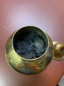 In 1989 Collette intended to encase the pants in 10,000 pounds of poured molten glass. During the pouring process, the pants were to be protected by an insulated container. However, the container fractured allowing the pants to burn. The ashes were deposited into a brass urn and given to Kunkel ending the tradition.[1]