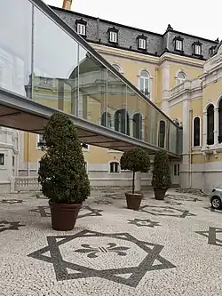 View of the Tagus River and the 25 de Abril Bridge from the palace.Patio showing the 20th-century renovation by architect Manuel Tainha.