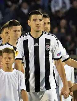 On 13 July 2013 Grbić joined Partizan on loan from Olympiacos.[12] In January 2014, Olympiacos officially traded Grbić to Partizan in an exchange for Marko Šćepović.[13] On 18 March 2015 Grbić scored the opening goal in the 2015 Serbian Cup semi-final, after which he ran to his team's bench to put on a second left cleat.[14] The stunt was meant as a response to Serbia's Prime Minister Aleksandar Vučić, who commented before the match that "some players in Partizan have two left legs".[14] Vučić apologized on his Twitter profile and congratulated Grbić in his tweet.[14]
