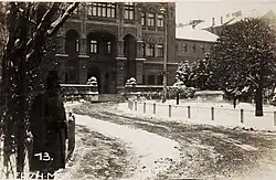 Kočić left Gomionica after two years and completed his primary education at the Eastern Orthodox religious school in Banja Luka, though he returned to the monastery every summer in order to spend time with his father. Kočić was the best student in his class at the religious school, and upon graduating in 1891, he departed for Sarajevo to attend high school at the First Sarajevo Gymnasium. During his first three years, he excelled in subjects such as mathematics, as well as Greek, Latin, German and Serbo-Croatian, which the Austro-Hungarians deemed the "language of the land" (zemaljski jezik), so as not to become entangled in local ethnolinguistic disputes. Kočić experienced a violent fit in his fourth year, swearing at a theology teacher and throwing a textbook at him over a poor grade. He was dismissed from the classroom and subjected to a monetary fine.[2] According to a classmate, the outburst changed Kočić, "turning him from an ambitious, disciplined student, into a truant and frequenter of kafanas and bars."[2] Following an incident in which a visibly intoxicated Kočić and his friends verbally abused Muslim students in a hotel bar, Kočić was expelled from the Gymnasium.[4][a] He found himself unable to enroll into any of the high schools in Bosnia, having apparently drawn the ire of the Austro-Hungarian authorities.[2] Kočić was forced to continue his education in neighbouring Serbia and enrolled into a Belgrade high school, from which he graduated in 1899.[2]