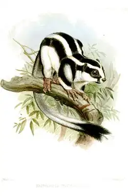 Petauridae is a family of possums containing 11 species: four species of trioks and striped possum (genus Dactylopsila), eight species of wrist-winged glider (genus Petaurus), and Leadbeater's possum (Gymnobelideus leadbeateri), which has only vestigial gliding membranes. Most of the wrist-winged gliders are native to Australia, whereas most of the striped possums to New Guinea, but some members of each group are found on both sides of the Torres Strait. Leadbeater's possum is endemic to Victoria, Australia.