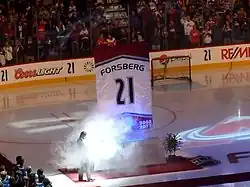 On 8 October 2011, Forsberg had his jersey number retired prior to the Avalanche's 2011–12 season opener at the Pepsi Center.[58] On 26 February 2015, Forsberg had his number officially retired prior to a Modo game at the Fjällräven Center in his native Örnsköldsvik.[59]
