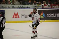 Forsberg remained in Sweden, playing for Modo for the following three years. In 1993, the team was eliminated in the playoffs quarterfinals against Malmö, but Forsberg won the Guldpucken for Player of the Year and the Guldhjälmen for Most Valuable Player of the Elitserien, an award decided by the players.[18] He won both prizes again in 1994 when, after barely making the playoffs, he led his team to their first final since winning the Elitserien playoffs in 1979.[18] In a five-game series, again against Malmö, Forsberg scored in overtime in Game 2 to put his team one win away from the title. However, he suffered from the flu (influenza v) and Modo lost the remaining games of the series and the title.[19] By this point, Forsberg was thought to be the best player in the world outside the NHL.[20] After losing the deciding game 3–1, Forsberg expressed his frustration on the ice, first by breaking his stick and then in an interview where he criticised the game's referee, Börje Johansson, for giving Malmö many power plays, resulting in their first two goals, and then increasing the tolerance level. Forsberg's words that he wanted to give Börje a hit has become popular in Swedish ice hockey areas. Börje later denied calling the game in favor of Malmö and stated that Forsberg hadn't given him a hit.[21]