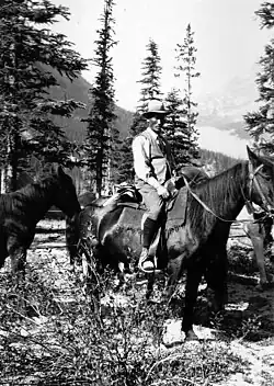 Thorington and Cromwell had one major reason to visit Canada: To locate the real source of the Columbia River[36] in the southern Purcell Range. The geographer and explorer David Thompson (1770 – 1857) had declared in 1807 that the River originated from Columbia Lake. Thorington and Cromwell were determined to examine the creeks and glaciers that fed into Columbia Lake, and thereby discover the actual source of the Columbia River. To achieve this goal, they had employed Peter Kaufmann and the renown Austrian mountaineer and wrangler, Conrad Kain (1883–1934), as their guides. At age 47, Kain had reduced his climbing and had established himself as a wrangler, providing pack-horses for wilderness excursions. Having gone ahead with supplies and horses, Kain met Kaufmann, Cromwell, and Thorington on July 18, 1930, at Walter and Melrose Hawke's Justamere Ranch in the Windermere Valley.[37][38]