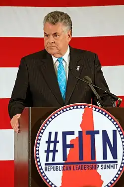 King was one of five New York Republicans in the House to vote against the Tax Cuts and Jobs Act of 2017.[45] He voted against it due to the $10,000 cap the bill would impose on the deductibility of state, local, and property taxes and the impact that would have in New York, a high-tax state.[46] Upon the possibility of a second round of cuts, King reiterated he would be "forced to oppose" more tax cuts if legislation included a provision "permanently extending the $10,000 cap on the state and local tax (SALT) deduction".[47] Only twelve Republican members of Congress in total voted against the bill.[48]