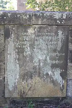 Peter Murdoch died in 1761. He is buried against the south wall of Glasgow Cathedral burial ground.
