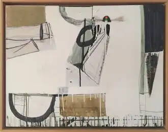 Critics noted a building complexity and immediacy in Plagens's output from 1989 to 2000, the result of a more expansive mix of materials, markmaking and palettes.[6][38][39] In paintings such as Benton Way and Sunset, LA, 6/28/55, 1:40 pm (1989) and Learning of the Tragic News (1996),[40] he introduced expressive drips and gestural, free-form marks and shapes, that Michael Kimmelman wrote had "a looping calligraphic eloquence" recalling Arshile Gorky and Richard Diebenkorn.[38][41][17] Of particular note were the small, brightly colored, discordant geometric forms that Plagens set against primarily off-white and slate-gray backdrops, which critics suggested "snapped" his rhythmic compositions into place.[38][6][32]