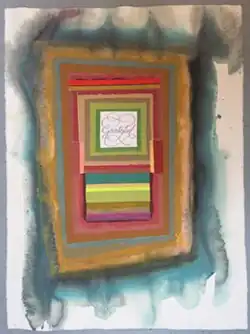 Plagens's recent works on paper, such as The Sinister Man 2 (2018), have largely relied on centralized compositions, anchored by collaged photographs or found paper with text or graphic images that are contained by colored-paper or painted rectangular fields.[33][45] Smaller in scale and less off-kilter in composition, these works have been seen as expressing a greater intimacy and poignancy than Plagens's paintings.[33][21]