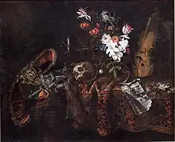 While he painted some pure vanitas paintings, the vanitas theme is also present in his flower paintings. For instance, in the Floral still life in a niche with a stag beetle discussed above the wilting flowers express the vanitas theme of impermanence and death. A pure vanitas painting is his composition Vanitas still life (dated 1668, Museum Catharijneconvent in Utrecht). This composition contains the typical symbols present in vanitas paintings: a skull with a laurel wreath (referencing the passing of glory), dice (referencing the vicissitudes of life), a wine glass, sheet music and a violin (refencing the fleetingness of physical and spiritual pleasures), wilting flowers and an hourglass (refencing decay and the passing of time). The Vanitas still life in the Maribor Regional Museum in Maribor reprises many of the same symbols. In this work, objects that allude to military glory (military distinctions, a sword) are placed on the left while those referencing cultural achievements such as books and music are placed on the right. Physical and spiritual achievements are placed among the symbols of death and decay such as the extinguished candle, the skull and the wilting flowers to convey the idea that all achievements eventually fall into oblivion or extinction.[12]