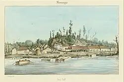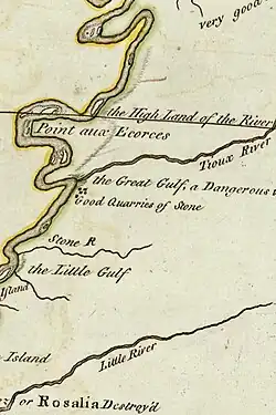 A French traveler described the spot in 1700, "We left the Natchez and coasted along to the right, where the river is bordered with high gravelly banks for a distance of twelve leagues; at the extremity of these bluffs is a place we called Petit Gulf, on account of the whirlpool formed by the river for the distance of a quarter of a league."[7] The name Petit Gulph appears on maps as early as 1715.[5] Travelers of 1739 described Petit Gulf's dangerous waters: "Here...we encountered for a quarter of a league extremely violent currents," and three of their eight boats ran aground on a midstream island and had to be rescued "by the efforts of a boatload of negroes which we had dispatched to their assistance."[8] A 500-acre land grant was issued to John Campbell in 1772 "above Fort Panmure...at a place known by the name of the Little Gulph." [9] A settler of 1774 called it Petit Gouffre and called Bayou Pierre the Stony River, recording in his journal "From Fort Rosalie to Petit Gouffre is ten and a half leagues. There is firm rock on the east side of the Mississippi for near a mile. The land near the river is high, very broken, very rich, and several plantations have been opened. From Petit Gouffre to Stoney river is a league and a half."[10] The first white settler, a Mr. Campbell, arrived in 1798.[5] The first business or shop was reportedly opened in 1800.[11] The landing played a role in the Aaron Burr conspiracy trial; a soldier testified he saw guns being loaded onto Burr's own boat at Petit Gulf.[12]
