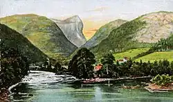 • 1.0 km (0.62 mi) northerly in a steep valley, to a bend in the river corresponding to a creek (coming from the east);