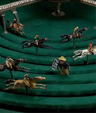 Petits-Chevaux, French for "little horses", is a gambling game played with a mechanical device consisting of a board perforated with a number of concentric circular slits, in which revolve, each independently on its own axis, figures of jockeys on horseback, distinguished by numbers or colors. The bystanders having staked their money according to their choice on a board marked in divisions for this purpose, the horses are started revolving rapidly together by means of mechanism attached to the board, and the horse which stops nearest a marked goal wins, every player who has staked on that horse receiving so many times his stake. Figures of railway trains and other objects sometimes take the place of horses.