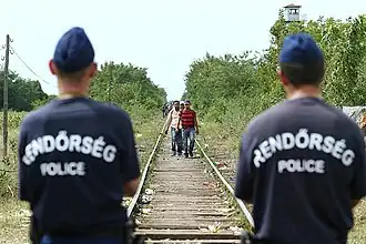 The Petra László incident took place near Röszke, Hungary, on 8 September 2015, during the European migrant crisis, when Hungarian camerawoman Petra László (Hungarian: László Petra, [ˈlaːsloː ˈpɛtrɒ]) was recorded kicking migrants who were fleeing border police.[1][2] László was fired after footage of the incident spread in the media and online.[1] In September 2016, she was indicted on charges of breach of peace, and was later found guilty.[3][4][a] However, in 2018, the highest court in Hungary reversed the ruling, clearing László of the charges. In its decision, the court stated that her actions constituted only rowdy behaviour, which is a misdemeanour. By then, the statute of limitations for misdemeanours had already expired, and the case was therefore closed.[6]