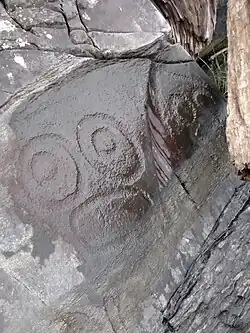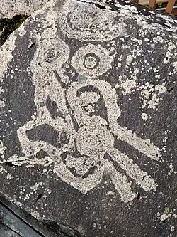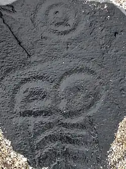 The petroglyphs that remain here are found on the boulders and bedrock outcrops on the shore, just below and above mean high tide. It is thought that they were created by members of the Tlingit tribe[3] and most of the petroglyphs can be found close to places of importance such as salmon streams and sites of habitation.[4] They depict whales, salmon, and faces of the community.[2] The rock here is metamorphic and tends to be a dark gray that is finely grained, moderately durable, and easy to fracture, which would make it easier to manipulate for petroglyphs. Here are some of the most concentrated petroglyphs in the world.[2] Petroglyphs and associated site components are under the protection of federal laws and State of Alaska Antiquities Laws.[5]