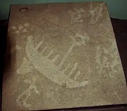 The stone is generally believed to have been carved by the Algonquian or Iroquoian speaking people between 900 and 1100 AD., if not somewhat earlier during the Archaic. Today, the First Nations people of Ontario call the carvings Kinomagewapkong, meaning "the rocks that teach" or "the Teaching Rocks". Originally two to three inches deep the 1200 carvings were made using gneiss hammers to incise human figures, animals, and a dominant figure whose head apparently represents the sun, onto the soft, gently sloping walls.[5]