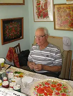 In 1998, the Experimental Workshop became the basis of the Petrykiva Center of Folk Art under the direction of Andrii Pikush. Today, it is considered to be the nucleus of the Petrikivka painting style. The Center brings together approximately 40 leading Petrykivka artists, including (as of 2011) 25 members of the National Union of Artists of Ukraine and 7 Distinguished Folk Artists of Ukraine.[7][16] This institution has been a home to such artists as Volodymyr Hlushchenko, Nina Turchyn, Valentyna Deka, Lidia Bulavin, Maria Yanenko, Valentyna Panko, and Halyna Nazarenko.[16] In addition, many significant artists currently live in Petrykivka village but do not work at the Petrykivka Center, and a number of other artists trained in classical Petrykivka painting live and work in various cities throughout Ukraine, where they continue to develop the Petrykivka style.
