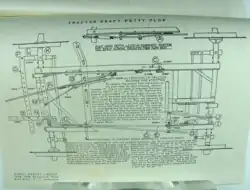 A subsequent prototype plough was constructed using the front axles from two T Model Fords.[1] All four wheels were steerable. Front and rear wheels turned independently of each other. The tyres were removed, and the plough ran on the rims of the wheels, which had wooden spokes. The main structural members of the plough were made from 4-inch hardwood, joined at each end by specially made steel strips bolted to the timber. The operator sat on the plough and steered using a series of levers and foot controls.