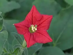 Petunia exserta has a bright red corolla with distinctive exserted stamens and stigma, the latter which are typically associated with hummingbird pollination. It shares the erect habit, and similar corolla, pollen, and stalk attributes of Petunia axillaris and Petunia secreta.[3] The flowers have no fragrance, which is not necessary for attracting hummingbirds, who have little sense of smell.[1] The red color is due to several anthocyanin pigments, which are different from the cause of red color in modern hybrid petunias.[2]