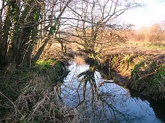 The wharf at Haslingbourne has entirely disappeared and an electricity sub-station and a former water treatment plant, which pumped water from springs at the foot of Gore Hill to Petworth, are on the site. The area is now used for storage of construction machinery. Below Haslingbourne Cottages the stream flows in the canal bed which is cut through sandstone beds, creating a shaded artificial gorge rich in mosses and lichens. Emerging from this cutting at the site of Upper Lock the canal follows a straight course across low lying boggy ground, fenced off as a nature reserve area. Reaching the site of Haines Lock the stream can be heard pouring through a broken down weir in the undergrowth as it turns eastward into its natural course. The west bank of the canal here runs into the pasture for some twenty metres and the position of the levelled course beyond can just be discerned. Beyond the slightly higher ground here, as the Haslingbourne Stream again comes close to the canal, the embankments can be seen forming a straight line across the floodplain to the river. A pond near the river is the site of a weir and tumblebay.