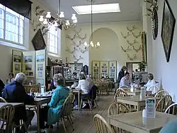 The trust run two car parks for visitors, a main car park ideally placed for the house and pleasure gardens and a more northern car park for the wider deer park. With the exception of a visitor reception near to the main car park and a food and beverage kiosk in the old fire station, the visitor amenities are all located within the old service block for the house. This service wing contains the site shop, a second-hand bookshop,[19] a cafe in the old Audit Room (which opened originally as a sculpture gallery before being used as a hall for large gatherings of the estate staff and servants),[20] toilets and a seasonal art gallery. The service wing also contains a few of the historic kitchen rooms preserved for the public to view.[21]