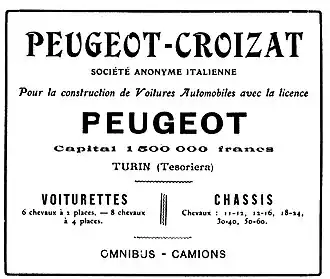 The automobiles were produced by Vittorio Croizat in Turin. Croizat was an engineer and sold Rambler bicycles. On December 27, 1905, he founded the company Automobili Peugeot SA Brevetti for the production of automobiles with the brand name Peugeot Croizat. Three months later the company was renamed SA Italiana per la fabbricazione di Automobili Peugeot Croizat. The president of the corporation was Giovanni Goria Gatti. In November 1907, the company was liquidated and Officine Meccaniche Torinese took over the production.