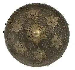 The Peurise Awe is a peurise (shield) of plaited rattan strips (glong). It may be covered with red or black cotton.[2] The diameter of this shield is approximately 35 to 45 cm (14 to 18 in). The outer part of the shield is strengthened with brass rivets, and inside there is a rope that is used as a handle. The outer part of the shield is decorated with six circular inserts (bushings) that are made of brass, and one brass star in the middle. The brass decorations are usually in the shape of a hexagram, similar to the Star of David. These hexagonal stars represent 'stars of security'.