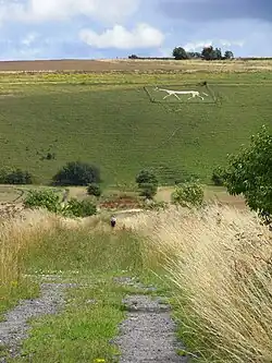 The smallest white horse in Wiltshire, Pewsey White Horse is 35 feet tall and 67 feet long.[10] Pewsey White Horse is cut on private land roughly a mile south of Pewsey Village, on a steep NNW facing slope of Pewsey Hill about 500’ above sea level. Access to the horse is available to visitors.[7] The horse can be seen from along the A345 near Pewsey Village and along the south of the village itself, but the horse is viewed most clearly from the Pewsey to Everleigh road below Pewsey Hill. The figure can be visited from the top of Pewsey Hill where there are footpaths leading to the horse and places where a car may be parked (although not designated parking places).[7]