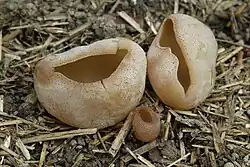 The pale, cup-shaped ascocarps grow to 1–6 centimetres (1⁄2–2+1⁄2 inches) in width and often form clusters. The spore print is white.[2]