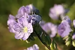 The inflorescence is a one-sided curving or coiling cyme of many flowers. Each funnel- or bell-shaped flower has deeply veined, hair-lined sepals and a blue corolla with a pale throat.