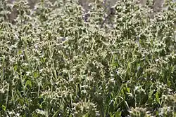 It is a perennial herb growing mostly erect to a maximum height near 40 centimeters. It is very glandular and coated in stiff hairs. The lower leaves are up to 15 centimeters long and sometimes divided into smaller leaflets; leaves higher on the plant are smaller and generally undivided. The hairy inflorescence is a coiling cluster of cylindrical white flowers, each about half a centimeter long and with five long protruding stamens.