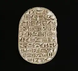 In Regnal Year 2, Amenhotep married Tiye, the daughter of Yuya and Thuya. Tiye was the Great Royal Wife throughout Amenhotep's reign. Many commemorative scarabs were commissioned and distributed during Amenhotep's reign. On the "marriage scarabs," Amenhotep affirmed his divine power and the legitimacy of his wife. With Tiye, Amenhotep fathered at least two sons, Crown Prince Thutmose and Amenhotep IV (later called Akhenaten). In addition, several daughters are frequently credited to the couple: Sitamun, Henuttaneb, Iset, Nebetah, and Beketaten.[16] Most of the daughters appear frequently on statues and reliefs from Amenhotep's reign.[17] However, Nebetah is attested only once, on a colossal limestone group of statues from Medinet Habu,[16][18] and Beketaten only appears in Amarna.[19]