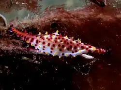 Phenacovolva rosea, also known as the rosy spindle cowry,[2] is a species of sea snail, a marine gastropod mollusc in the family Ovulidae, the ovulids, cowry allies or false cowries.[1] It lives and feeds on fan, whip and bush-type gorgonians.