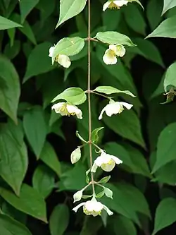 Most are deciduous but a few species from the south of the genus' range are evergreen. The leaves are opposite, simple, with serrated margins, from 0.5-6 inches (1–14 cm) long. The flowers are white, with four petals and sepals, 0.5-2 inches (1–4 cm) diameter, and commonly (but not in all species) sweetly scented. The fruit is a small capsule, containing numerous small seeds. The bark is thin and flaky, finely shredding in longitudinal strips.