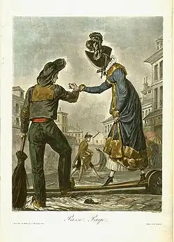 Debucourt's father-in-law was the sculptor Louis-Philippe Mouchy. In the marriage contract Mouchy generously offered to provide a three-room apartment at the Louvre, where Debucourt lived for twelve and a half years. The address of this apartment is often given on his prints.[4] Some of his work was satirical, such as La promenade publique, an aquatint of 1792 showing a crowd in the gardens the Palais-Royal.[2] As well as work from his own designs, he made aquatints after Carle Vernet, including the Horse Frightened by a Lion, the Horse Frightened by Lightning and the Strayed Huntsman.[1]