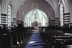 The altarpiece is a painting in a gilt carved frame by Danish artist Erik Jensen (1883-1974). The pulpit has gospel reliefs by M. Sørensen. Above the west entrance is a tympanon relief designed by Johan Rudolf Carl Nielsen (1863-1952). The inscription quoting the words of Philip the Apostle to Nathanael in John 1:45: "Come and see".[2] [3]