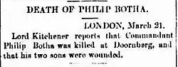 In January 1901 Philip Botha ordered the execution of British Lieutenant Cecil Boyle who was accused of ill treatment of Boer women and children in Dewetsdorp.[9][10] Botha was called upon to account for this, but was killed in action in a small skirmish with British troops at Doornberg near Ventersdorp on 6 March 1901.[11]