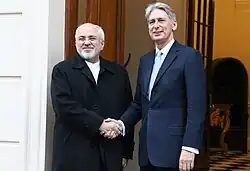 On 14 July 2015, after several years of on-again-off-again negotiations, the P5+1 reached agreement with Iran over the Nuclear program of Iran. Hammond was present in Vienna as the UK representative for the Joint Comprehensive Plan of Action disclosure ceremony.[40] Hammond presented the deal in Commons the next day,[41] and was in Jerusalem for a joint press conference with Benjamin Netanyahu, which was described as "tense".[41][42]