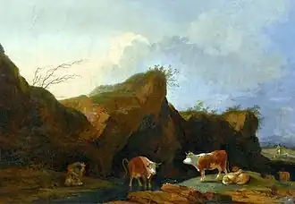 Rejecting a religious calling, Loutherbourg decided to become a painter, and in 1755 placed himself under Charles-André van Loo in Paris, and later under Francesco Giuseppe Casanova. His talent developed rapidly, and he became a figure in the fashionable society of the day. He first exhibited at the Salon of 1763 where his Landscape with Figures and Animals attracted praise from Denis Diderot. He followed this up with further success at the Salon of 1765 with two paintings including Morning After the Rain. In 1767 he was elected to the French Academy, although below the age required by the rules of the institution, and painted landscapes, sea storms, and battles, all of which work had a celebrity above those of the specialists then working in Paris. He made his debut with the exhibition of twelve pictures, including Storm at Sunset, Night, and Morning after Rain.[2]
