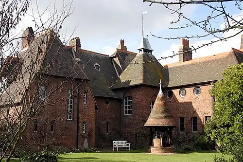 His friendship with the family of Sir Thomas Hugh Bell, a leading ironfounder of Middlesbrough, led to three commissions: Rounton Grange (demolished in 1953),[3] Red Barns House in 1868, in which Gertrude Bell lived as a child,[4] and the Bell Brothers office building in Middlesbrough (his only commercial development; later to be the Dorman Long offices).[5] An additional commission in the Cleveland area was Briarmead, completed in 1883, located north of Greatham village, near Hartlepool.[6] The adjoining St Francis Cottage was completed by W.F. Linton (Middlesbrough) in 1895 in the style of Webb.
