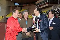 HSH Albert II of Monaco, receiving from the hands of Mr. Philip Zepter, the Zepter Cup. Louis II Stadium, Monaco.