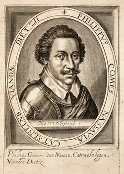 Philip of Nassau or Filips of Nassau (1 December 1566, Dillenburg – 3 September 1595, Rheinberg) was a Count of Nassau, Katzenelnbogen, Vianden and Dietz, fought for the United Provinces during the Eighty Years' War. He was the son of John VI and Countess Elisabeth of Leuchtenberg.