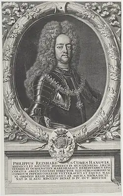 Philipp Reinhard died at his Philippsruhe Castle on 4 October 1712 alone. He was interred, alongside both of his wives, in the family vault in the Lutheran Church (now the St. Johann's Church in Hanau.[5] The tomb was destroyed when Hanau bombed during the Second World War.[6] His second wife, Wilhelmine Charlotte, survived him by 55 years.
