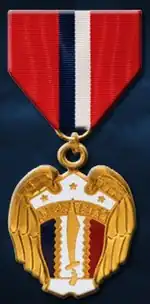The Philippine Liberation Medal is a military award of the Republic of the Philippines which was created by an order of Commonwealth Army of the Philippines Headquarters on December 20, 1944, and was issued as the Philippine Liberation Ribbon. The decoration was presented to any service member, of both Philippine Commonwealth and allied militaries, who participated in the liberation of the Philippine Islands between October 17, 1944, and September 2, 1945. A full-sized medal was authorized and added on July 22, 1945.[1]