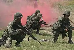 The Philippine Marine Corps (PMC) (Filipino: Hukbong Kawal Pandagat ng Pilipinas) is a naval infantry force under the command of the Philippine Navy. The PMC conducts amphibious, expeditionary, and special operations missions. The Philippine Marines share the traditions of both the US and Spanish marine units especially in the uniform and rank system.
