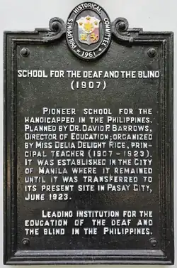 The school's establishment in 1907 was caused by David Barrows, an American anthropologist and the Director of Education at the time, inviting Delia Delight Rice to the Philippine Islands.[3] Rice is a teacher for people who are deaf and daughter of deaf parents. She played a role in initiating programs for individuals with hearing and visual impairments in the Philippines.[4]