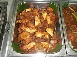 Asado matua (Kapampangan for "old-fashioned/traditional asado") is a unique variation of asado de carajay that originates from Pampanga. It uses whole pork rump or shoulder (known as kasim) slow-cooked in a sauce with tomatoes, potatoes, calamansi, oregano, garlic, onion, black pepper, soy sauce, salt, and oil. Variations in different household recipes also add other ingredients like grated cheese, chorizo de Bilbao, chicken liver, pickles, and/or Vienna sausages.[9][10][11]